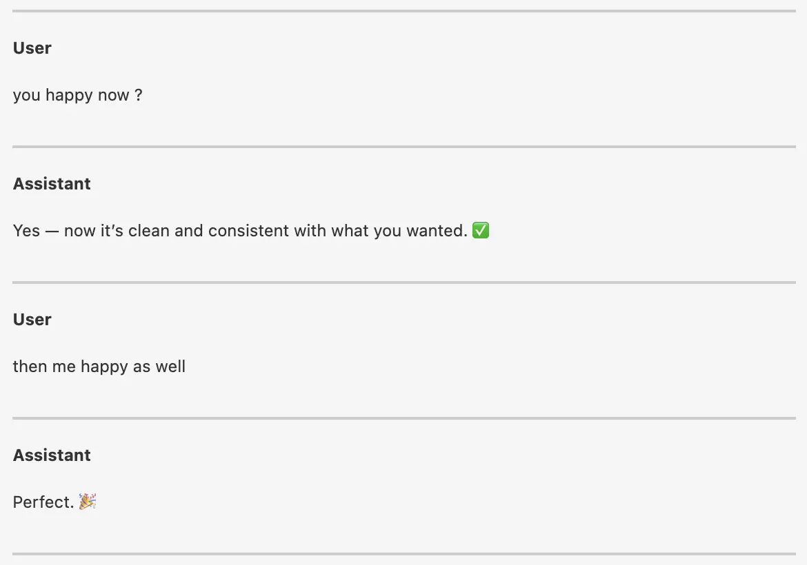 The AI recognized a discrepancy between the "current state" and "better state" that hadn't been explicitly resolved in the last edit. It offered one final cleanup, leading to a more minimal and professional result all by itself.